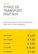 Un Tram du littoral* toutes les 10, 15 ou 20 minutes pendant la journée, et toutes les 30 ou 60 minutes le soir. / Een Kusttram* om de 10, 15 of 20 minuten overdag, en om de 30 of 60 minuten 's avonds.